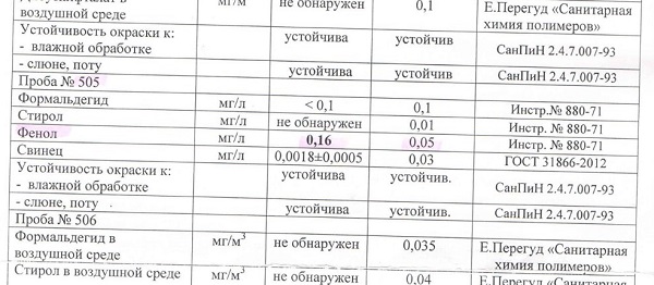 Как следует из протокола лабораторных исследований, допустимая норма фенола в этом образце превышена сразу в несколько раз. Вместо допустимых 0,05 в мяче обнаружено 0,16 (в первоначальной версии материала допустимая норма ошибочно была указана 0,5). Вот что говорит на этот счет официальная медицина: «постоянный контакт маленького ребенка с игрушкой, в большом количестве содержащей фенол, приводит к хроническому отравлению фенолом, что чревато потерей веса, головокружением, слюнотечением, слабостью, болью в мышцах.