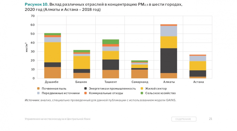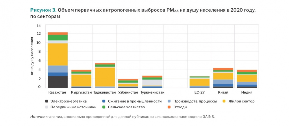 «Этот вывод явно противоречит широко распространенному в регионе мнению о том, что наибольший вклад в выбросы PM2,5 вносят передвижные источники (дизельные автомобили). Однако самый большой вклад в выбросы оксидов азота вносят передвижные источники. Основным источником выбросов SO2 является сжигание угля (в жилом секторе и для выработки электроэнергии), а в выбросах аммиака доминирует сельскохозяйственная деятельность (животноводство и внесение удобрений). Во всех странах ЦА, кроме Казахстана, уровень выбросов на душу населения сопоставим с показателями стран Европейского союза (ЕС).