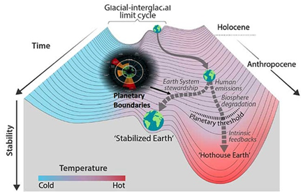Представьте себе, что климат Земли движется по разным траекториям во времени — путям, переплетающимся между совершенно разными климатическими состояниями. Различные пути через все возможные климатические условия могут сильно зависеть от различных переломных моментов. Самоусиливающиеся процессы обратной связи могут зафиксировать планету на определенной траектории на столетия или тысячелетия. Нет никаких доказательств того, что современные общества могут существовать, не говоря уже о том, чтобы процветать, в условиях, существенно отличающихся от относительно климатически стабильного голоцена, эпохи, которая началась около 11 500 лет назад, а затем была нарушена антропоценом, эпохой, характеризующейся общепланетарными антропогенными воздействиями. Изображение предоставлено Steffen et al. (2018).