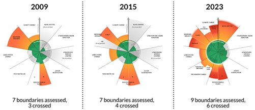 Эволюция структуры планетарных границ с 2009 по 2015 год и до 2023 года. Изображение предоставлено компанией Azote для Стокгольмского центра устойчивости Стокгольмского университета. По данным Richardson et al. 2023, Steffen et al. 2015 и Rockström et al. 2009 (CC BY-NC-ND 3.0).
