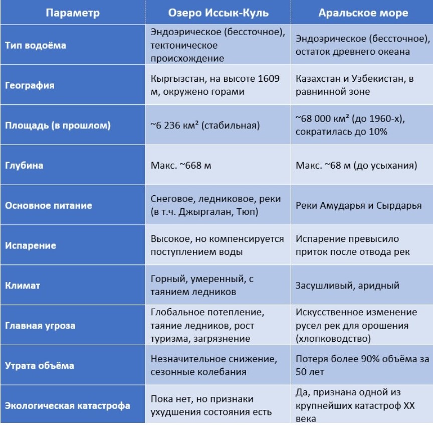 Иссык-Куль — одно из крупнейших озёр мира, жемчужина Кыргызстана. Вопрос о том, может ли его постичь судьба Аральского моря — трагически высохшего водоёма в Центральной Азии — сегодня звучит всё тревожнее. Несмотря на природные и географические различия, у двух озёр есть ряд схожих вызовов: изменение климата, антропогенная нагрузка и снижение уровня воды. Хотя по мнению специалистов, глубина, объем, природные условия и меньшая развитость водозабора делают Иссык-Куль более устойчивым по сравнению с Аральским морем. Но ведь и трагедия Арала начиналась практически аналогично: водозабор из Амударьи и Сырдарьи на хлопковые поля сначала казался экономически оправданным, но в итоге привёл к обмелению. Аральское море стало жертвой масштабной катастрофы, вызванной антропогенными факторами, где более 70% высыхания связано с ирригацией, из-за масштабного забора воды для орошения из питающих море рек, что привело к катастрофическому сокращению притока. С 1960 по 2016 год его площадь сократилась в 9 раз, объём — в 21 раз.